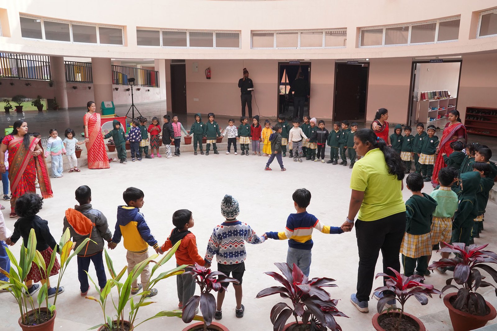 A two storeyed building with a unique round shaped architecture to allow light & air to flow freely inside the classrooms to give the children an ‘Open-Air Feel’.